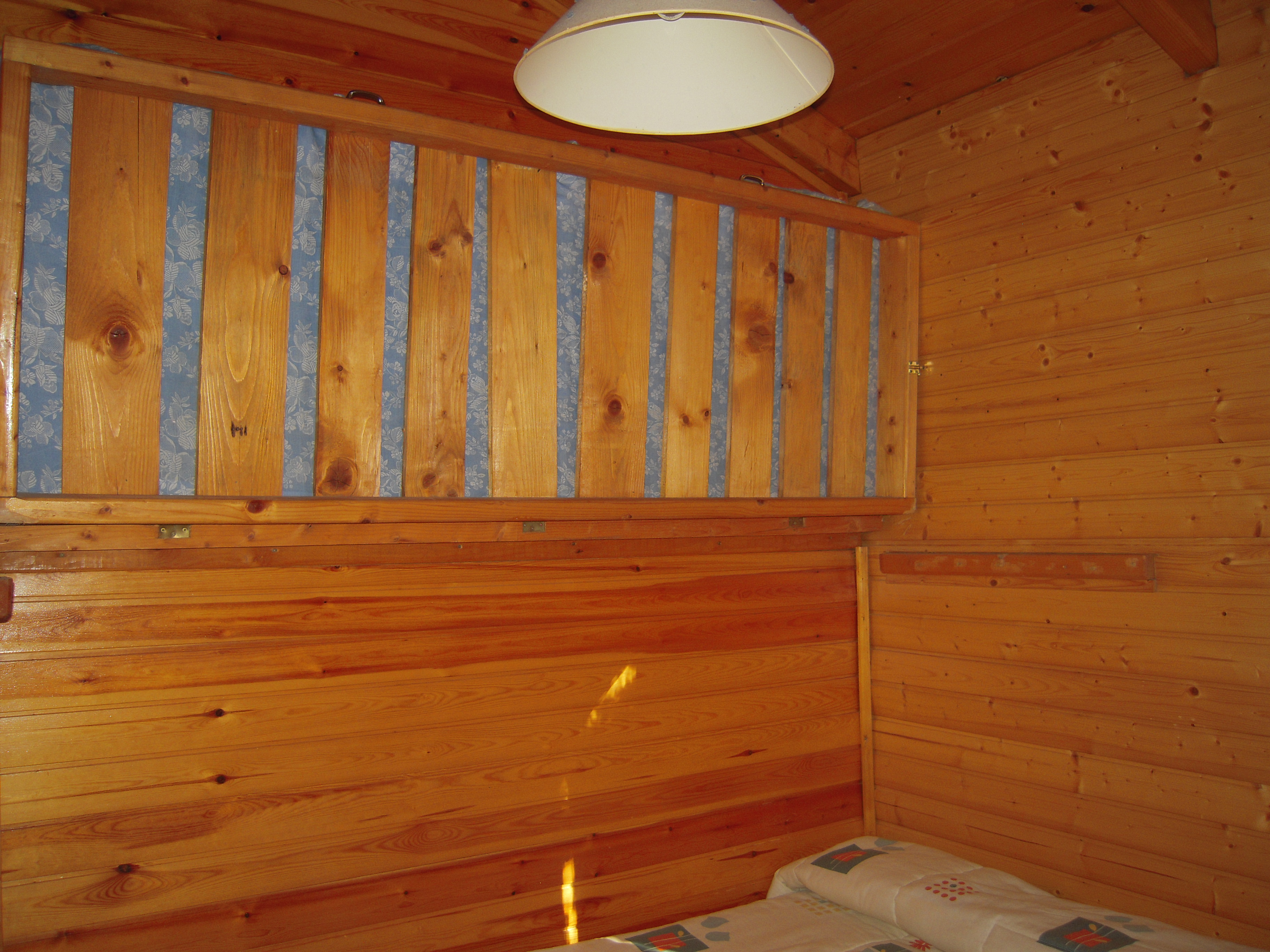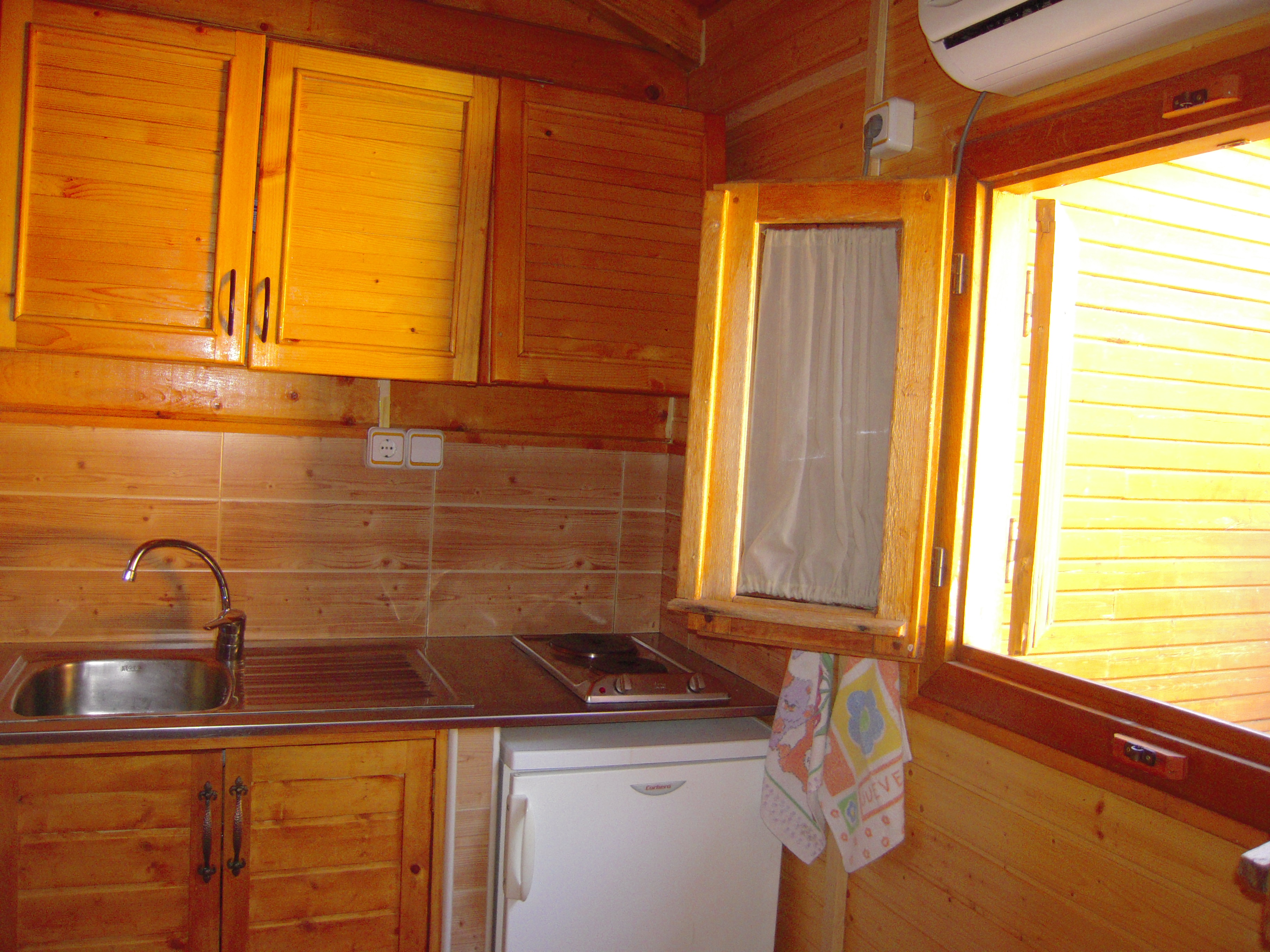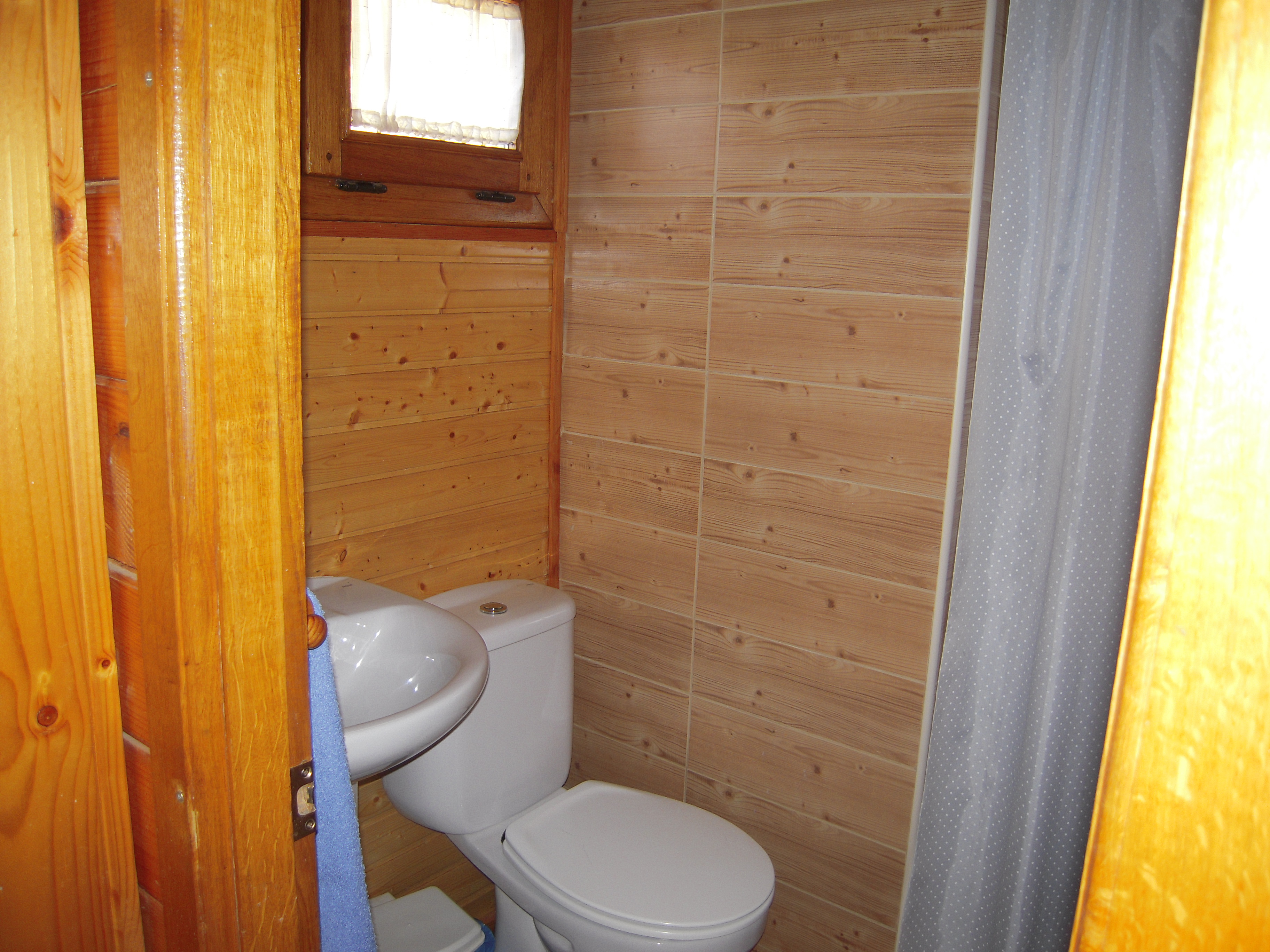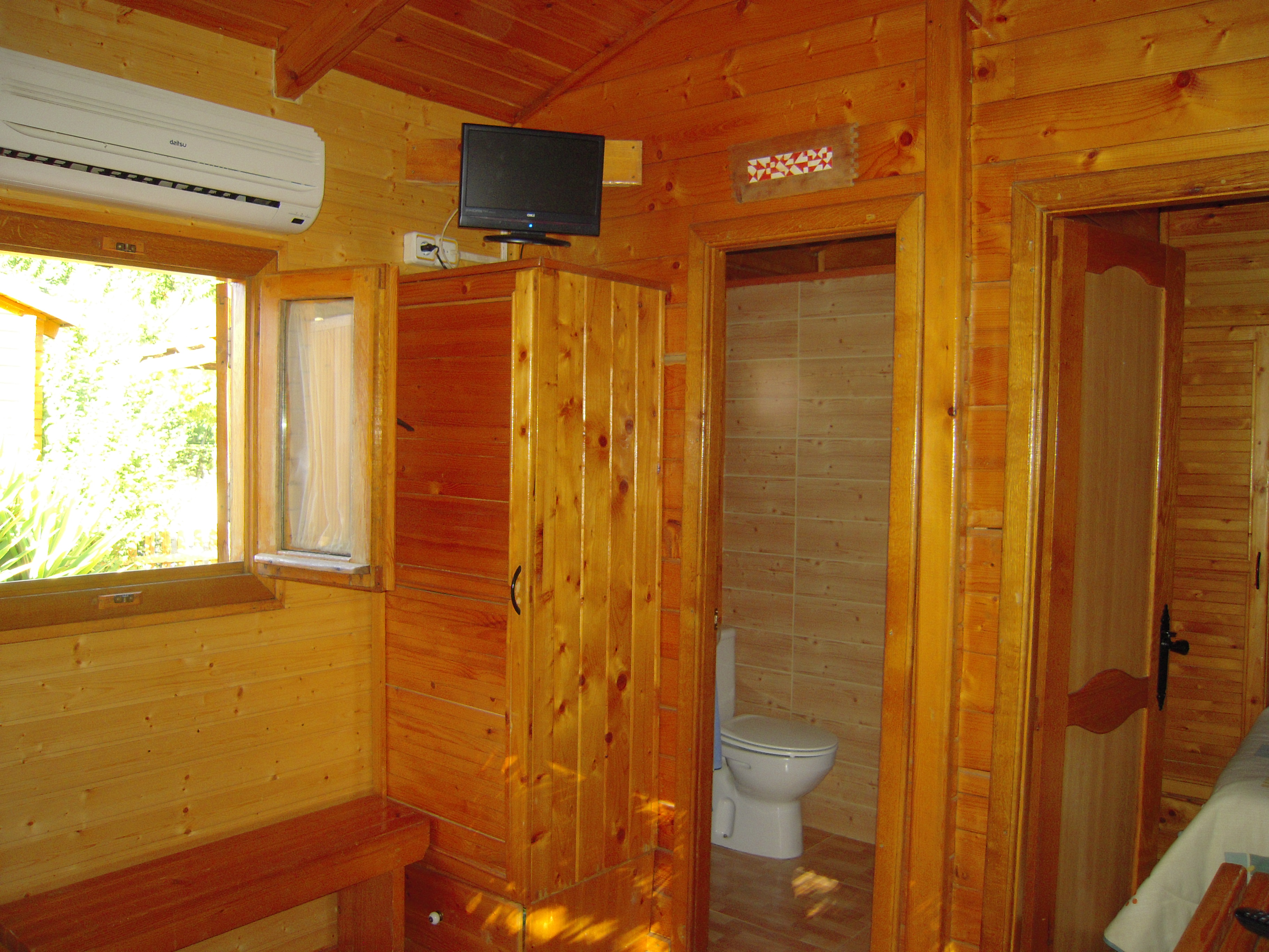 Our cabins are wooden houses which can hold up to 6 people. Here you will find a bedroom with double bed and a single bed built in the wall, that, if necessary, would be opened for a third place. A second room would be the lounge-kitchen, that has a basic kitchenware, like crockery, cutlery, glassware, cooking utensils… electric hob with extractor hood and a small fridge. In the lounge area you will find a comfortable double sofa bed and a second folding bed, as the one inside the bedroom. TV and air conditioning and heating. They have also complete bathroom and are equipped with bed linens, towels and blankets. If you want, you can also sit comfortably on the shady porch, equipped with table and chairs that you will find at the entrance to each cabin.